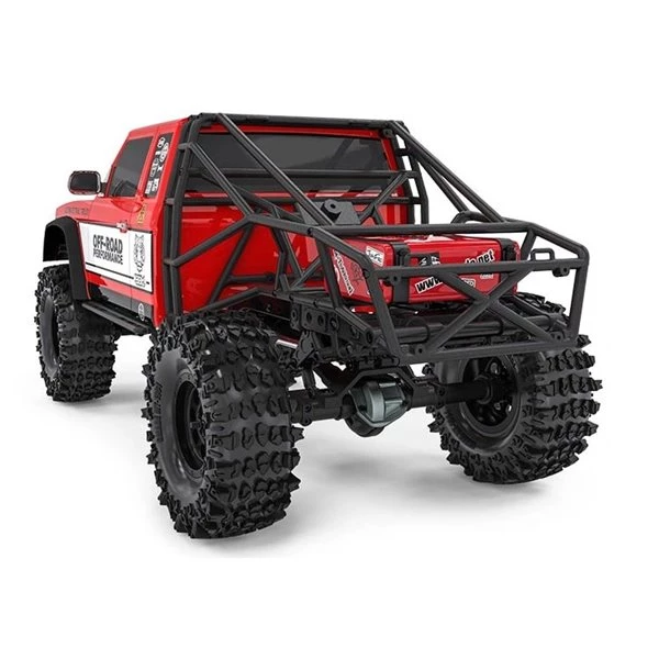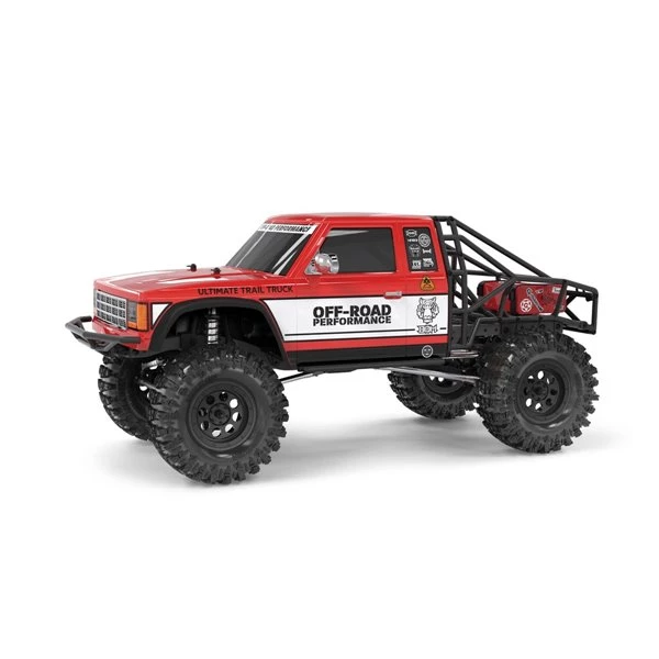The kit is built on a scale-looking ladder frame construction with stand-up front shock and lay-down rear dampers that make way for the scale roll cage construction. The steering servo is located in the front part of the chassis and the steering assembly is of a zero-Ackermann design for maximized steering performance. Angled front king pins minimize the scrub radius for further increased steering efficiency. The heavy-duty threaded aluminium shock absorbers utilize 3.5mm shock shafts and the transmission, with all-metal internal gears, is of a torque twist reducing design. Optionally a 2-speed hi/lo transmission conversion will become available to add speed when needed. The kit is rounded out by grippy tires, a cool looking body shell a couple of scale accessories.