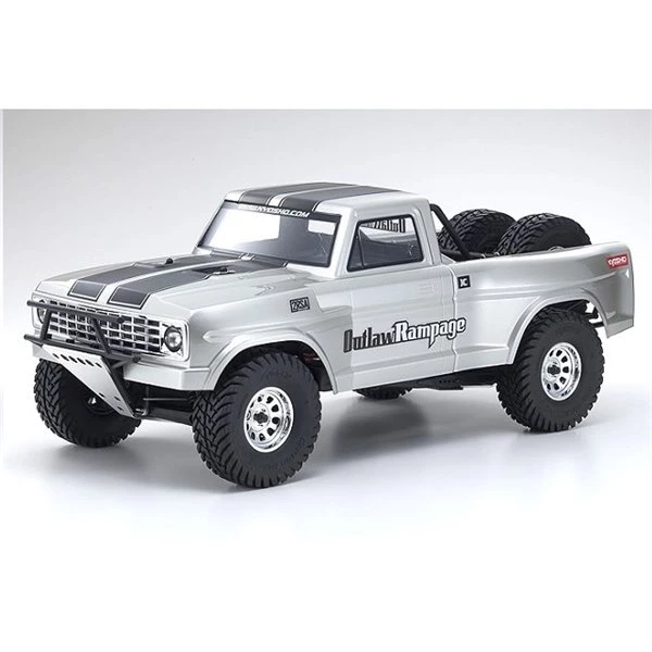 Embodying the defining mechanics of a real production model trophy truck, the scale 2WD Outlaw Rampage is about 70% pre-assembled in an ARR kit, including the optional upgrade components that mark this machine as a "PRO" version. Features include a spare tire carrying roll cage, long stroke aluminum oil shocks, stabilizers on front and rear with 3 different wire settings, and aluminum skid pads that protect the chassis. With easy control ability and a wider scope for setting adjustments, the true dynamic performance of 2WD truck racing is in your hands.