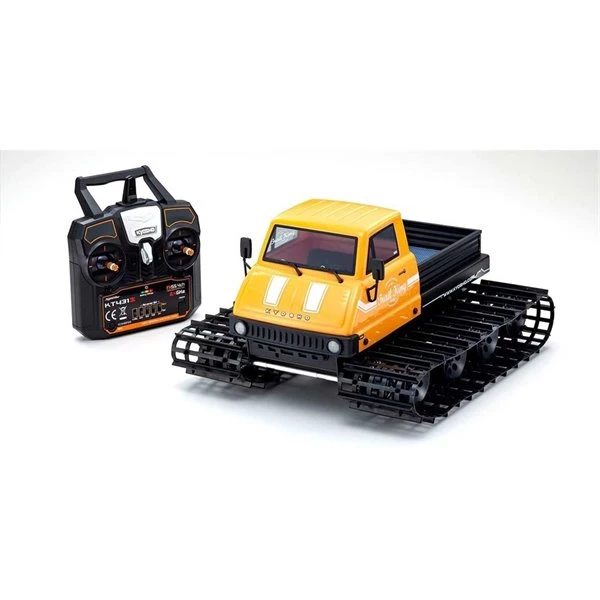 The newest edition to the 1/12 scale electric belt vehicle series further enhances your outdoor experience. Kyosho's long selling 'Blizzard' that has stood the test of time with a legion of loyal fans, has been used as a base for the new 'Trail King'. Among its many features, a completely new body design creates the retro feel of a hard working machine. In addition to the realistic finish with separate accessory parts, the underbody incorporates a cockpit and always-on front and rear LED lights. A loading platform also provides space for a variety of things to be carried. The Trail King enhances the enjoyment of nostalgic wilderness experiences across a wide variety of scenes with a chassis boasting heavy-duty specifications for smooth and easy travel across any surface including uneven rocky roads and steep gradients. Take control with forward, reverse, left/right and the complete left/right pivot turning capability of a belt vehicle. As the model is fully pre-assembled, the advanced mechanics of the Trail King are ready to be enjoyed straight away. Compatibility with spare and optional parts for the Kyosho 'Blizzard' allows you to expand your enjoyment of the snow and sand adventures even further.