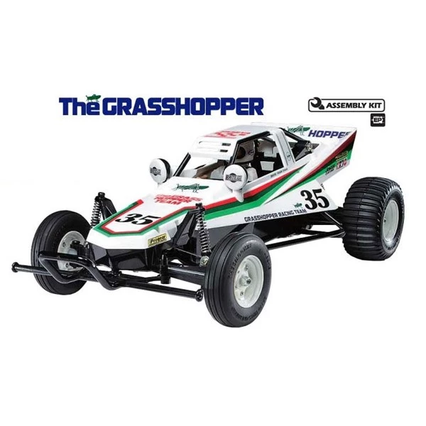 The perfect combination of simple assembly and tough exterior is what made the Grasshopper so special. Durable plastic body is fastened to bathtub resin monocoque chassis by screws, creating a solid frame that can absorb any type of rough handling. Off-road tracks can be tackled with ease thanks to coil spring dampers, and independent swing axle front and rigid axle rear suspension. Diff loaded sealed gearbox keeps out the dirt and stones for smooth driving and cornering. Paddle style rear tires and grooved front tires combine with 3-piece assembly type wheels for excellent grip performance on dirt tracks. Half-body driver figure adds that finishing touch to a fun off-road R/C car.