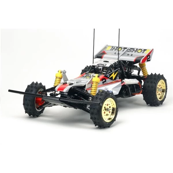 Tamiya originally released a special version of the R/C 4WD racing buggy Hotshot in 1986. This famous machine is set for a return as the Super Hotshot and features modern improvements while keeping the basic layout of the original. Distinctive external features such as the stylish silver body and rear wing, yellow oil dampers, and spiked tires with gold metal-plated wheels have also been kept.