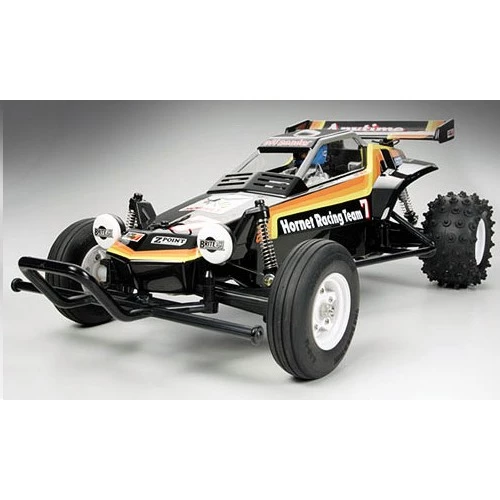 The Hornet stands as one of Tamiya's most popular R/C cars ever released, helping launch a 2WD R/C buggy boom worldwide. Featuring excellent performance on both dirt and on-road tracks, this awesome buggy can take on any type of terrain. Just like the original, this re-release features an easy to assemble chassis and drivetrain consisting of a durable but lightweight ABS resin bathtub frame, diff gear loaded sealed gearbox, oil filled rear dampers, powerful RS 540 motor and high performance suspension system. The Hornet is perfect for those that used to have one, those that have always wanted one, and for those that want a revolutionary buggy that has earned its place in R/C history.