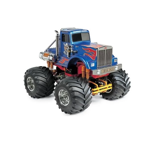 The R/C Bullhead features a body that was inspired by American tractor trucks, large diameter tires, and a twin-motor drivetrain for exciting monster truck action. The injection-molded body is detailed with metal-plated parts for the front grille and bumper, fuel tanks, exhaust pipes, air cleaners, and roll bar reproduced to provide a customized look. Massive 165mm diameter, 110mm width tires are mounted on metal-plated wheels. Suspension arms are also reproduced as metal-plated parts. A sticker sheet to recreate the flamboyant flare-pattern graphics is included.