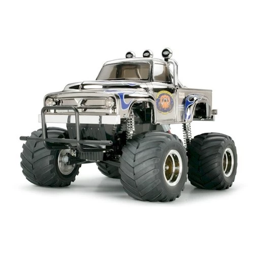 Combining a 1950's style pick-up truck body with massive monster truck tires, the popular Midnight Pumpkin is now available with a metallic body for even more eye-catching R/C action. The super-detailed body is made with the same technology as Tamiya's high-quality plastic model kits for the most realistic look possible. Metal plated wheels and damper cylinders further enhances this truck's custom look.